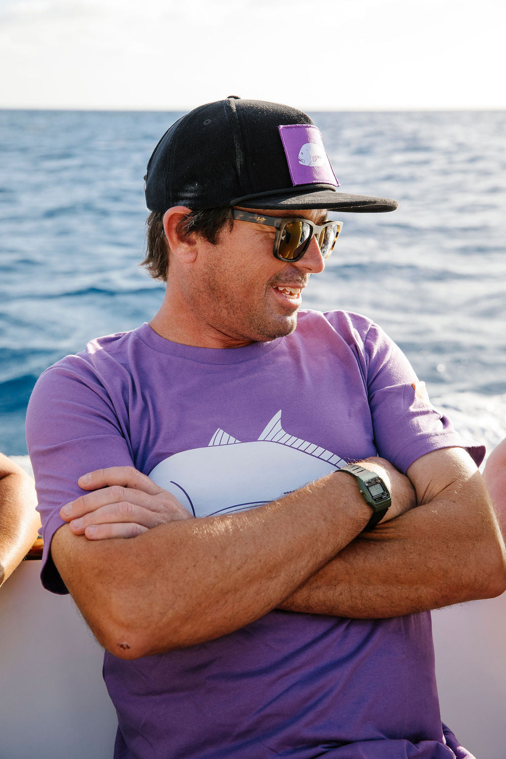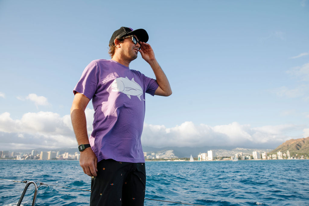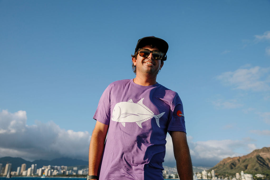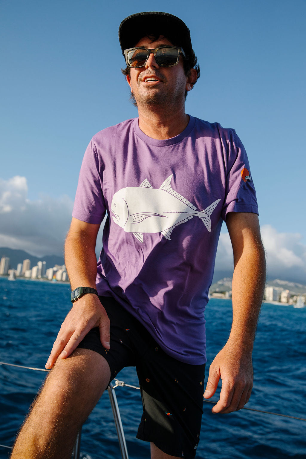 Our Giant Trevally/Ulua Fish T-shirt features a soft and modern fit. An original Sun Dot Ulua design is printed on the front and back center of the shirt and our logo is printed on the left sleeve.