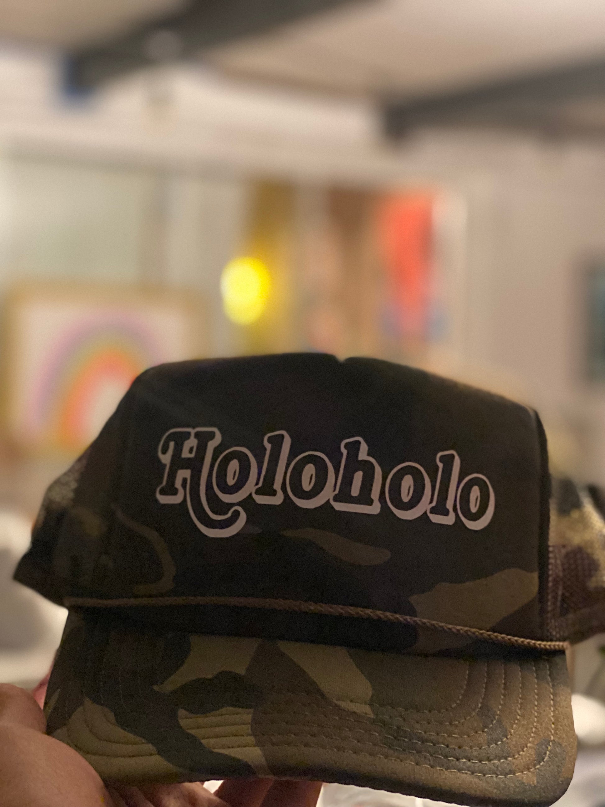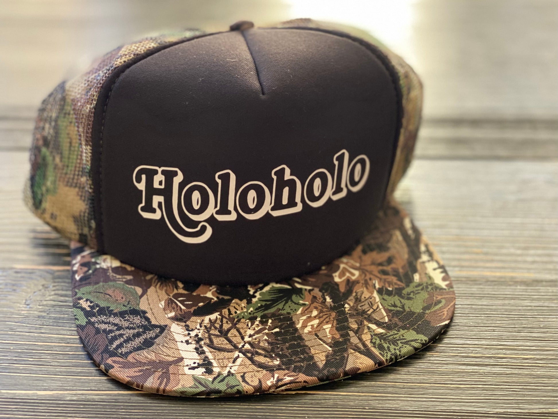Our favorite and most popular trucker hat, featuring our original Sun Dot Marine “Holoholo” design on an "Otto Brand" Camo hat.