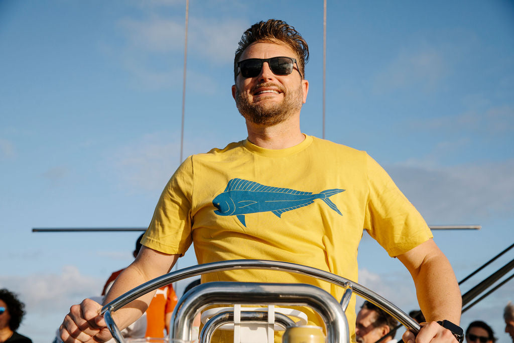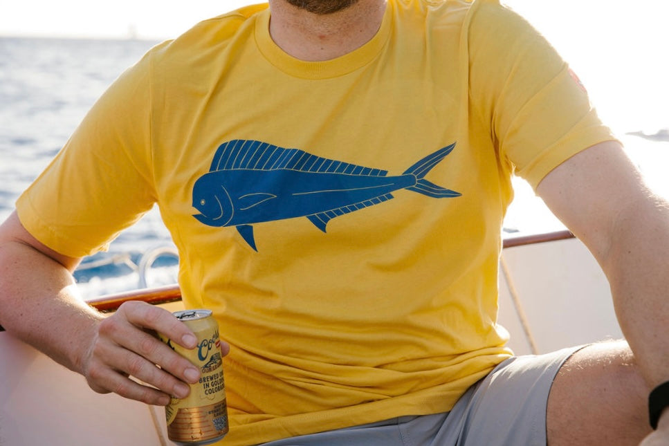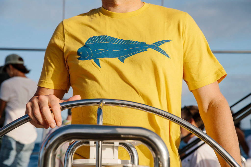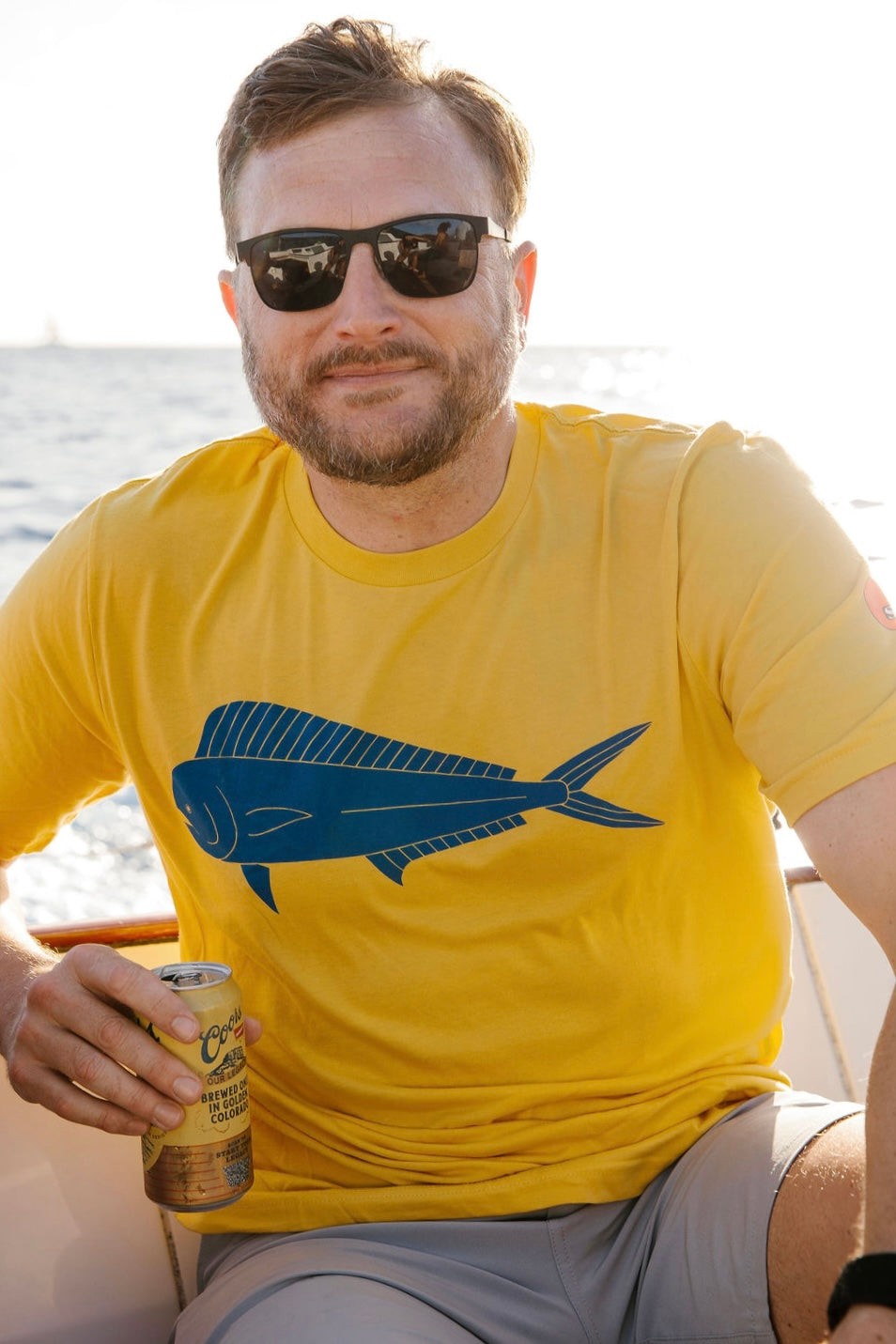 Our Mahi-Mahi Fish T-shirt features a soft and modern fit. An original Sun Dot Mahi-Mahi design is printed on the front and back center of the shirt In white and our logo is printed on the left sleeve.