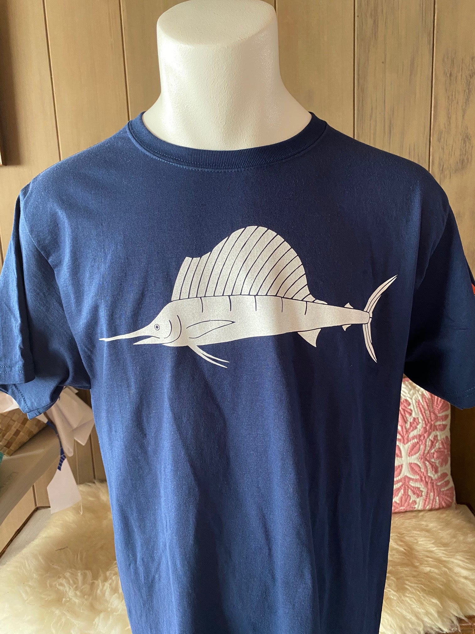 Tee is available in navy with white fish.