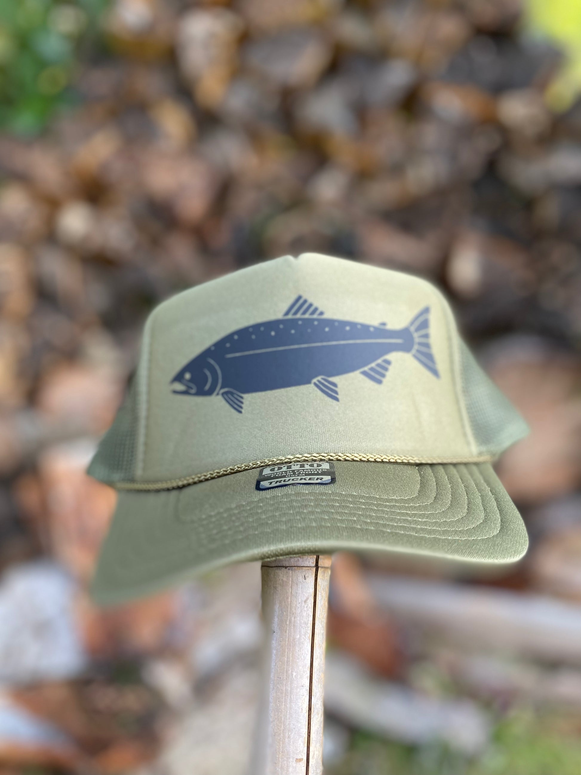 This salmon hat features our original design on an adjustable Otto brand trucker.