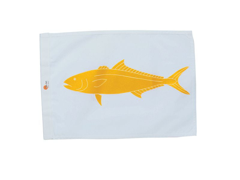 This flag features a yellow Yellowtail (Kahala) fish on a white flag.